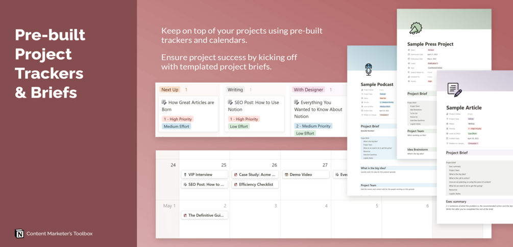 Pre-built project trackers and briefs.
